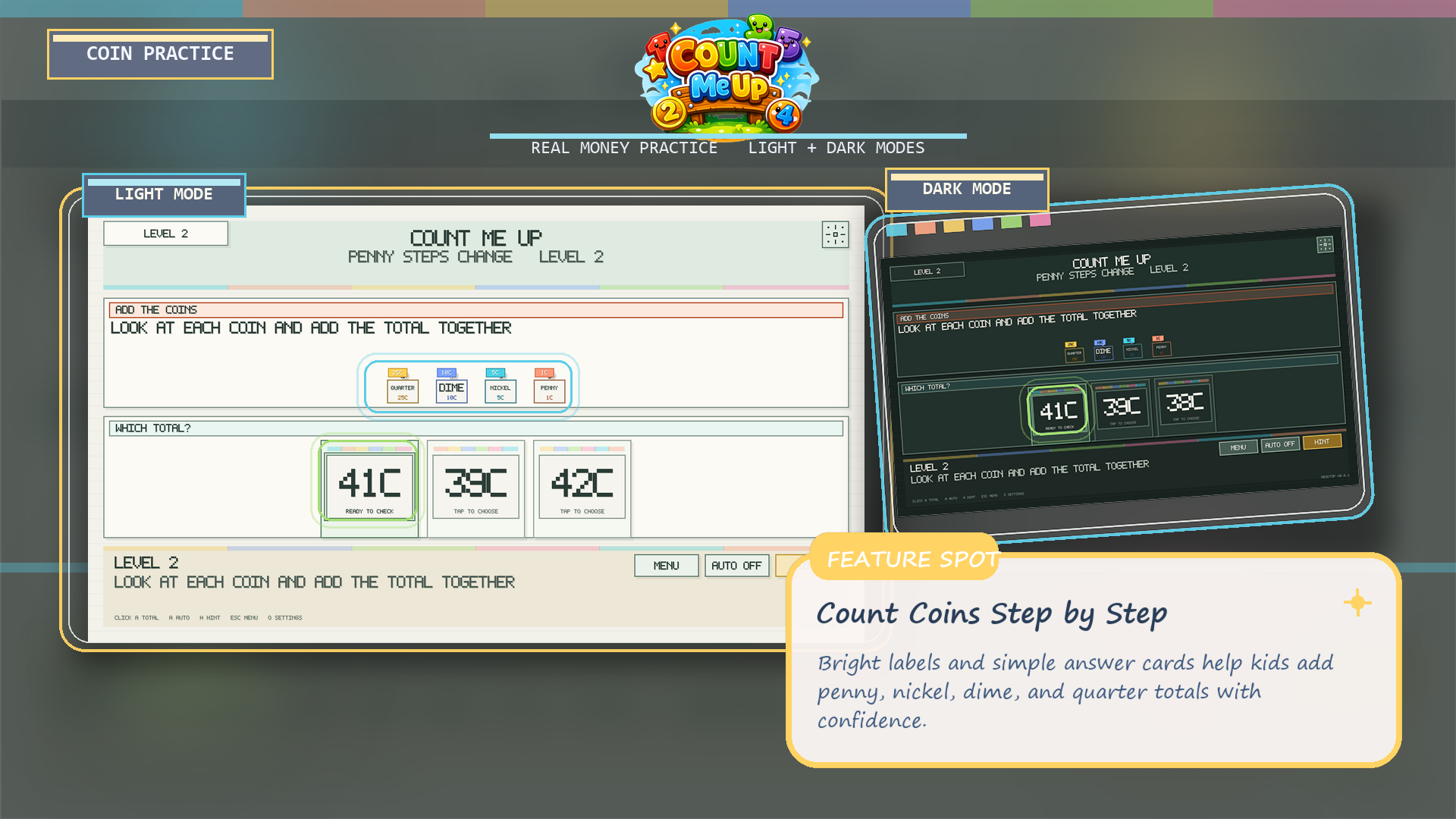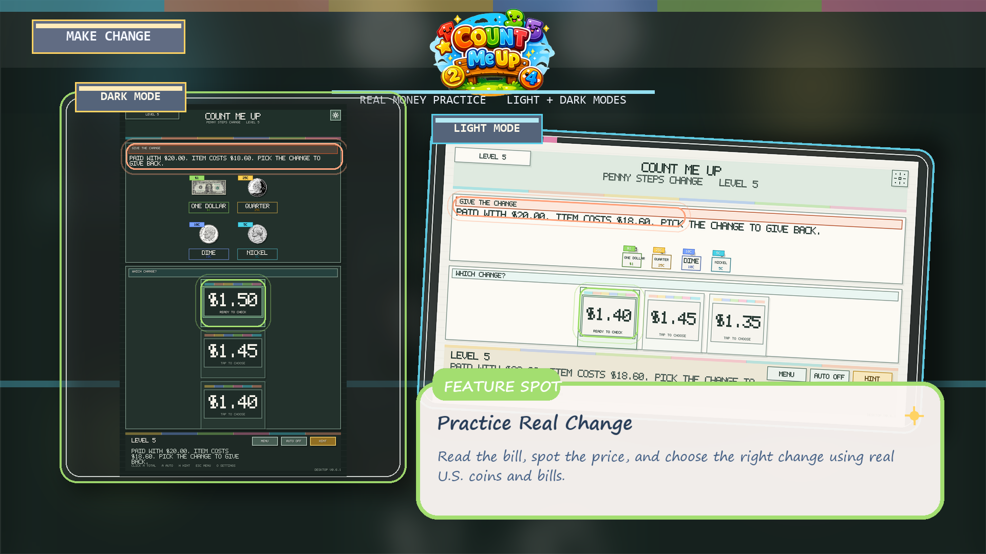 Count Me Up is a bright, approachable learning game built around real U.S. currency.